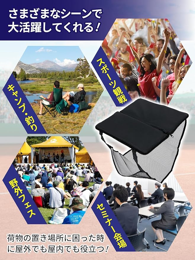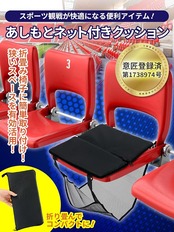 意匠登録商品(第1738974号) ●商品の特長 荷物の置き場に困る、スポーツ観戦やライブ鑑賞などに便利な、荷物収納ネット付きシートクッションです。狭いスペースでも座席下のスペースを有効活用して荷物を直接地面に置かずに済むので汚さず保管できます。 ●商品サイズ 座面340 340mm、ネット収納時340 170mm、収納ネット330 670mm 収納ネットはあしもとのスペースに応じて、面ファスナーの接着位置を変えることで長さの調節ができます。 ●素材 軽くて丈夫なポリエステル素材。 ●耐荷重 5キロまで収納可能なので、バッグやリュックなども入れられます。 ●本体色 黒 ●ご使用シーン スポーツ観戦、ライブ鑑賞、アウトドア、セミナー、研修など。座席下に空間がある椅子に対応しています。 ※座面と背もたれが一体になっている座席や座面が厚いクッションタイプの座席等、座席の形状によって取り付けできない場合がございます。