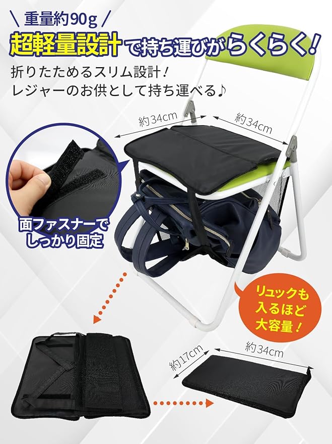 【面ファスナーで設置が簡単】椅子の隙間にネットを通して面ファスナーでピタッと固定!お子様でも簡単に取り付けられます。面ファスナーの接着位置を変えることで多様な大きさの荷物に対応できます。クッションを折り畳めばA4用紙より少し大きい程度のサイズになりますのでバッグにすっぽり収まりますので持ち運びがらくらく!