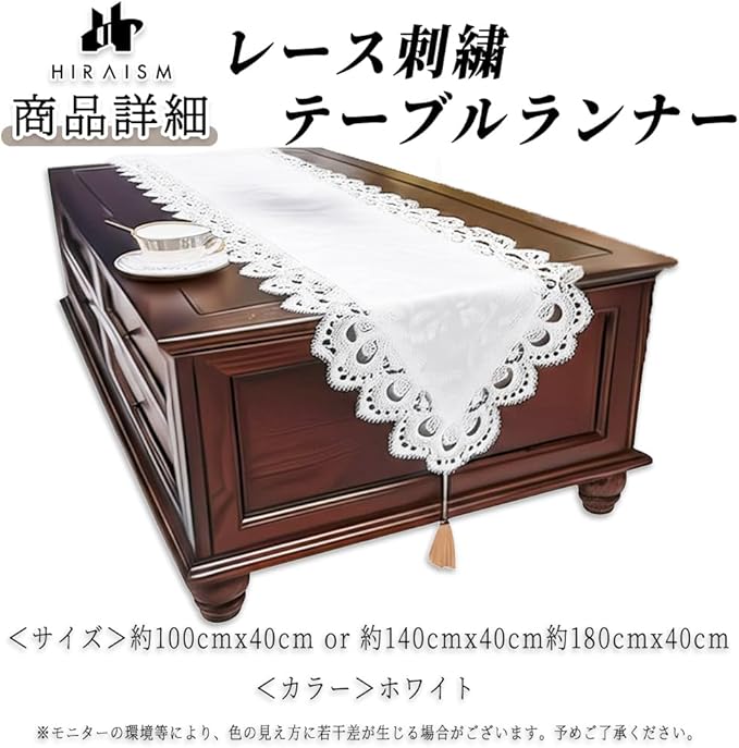 【商品内容】レース刺繍 リバーシブルテーブルランナー <サイズ>約100cmx40cm or 約140cmx40cm約180cmx40cm <カラー>ホワイト ※モニターの環境等により、色の見え方に若干差が生じる場合がございます。予めご了承ください。