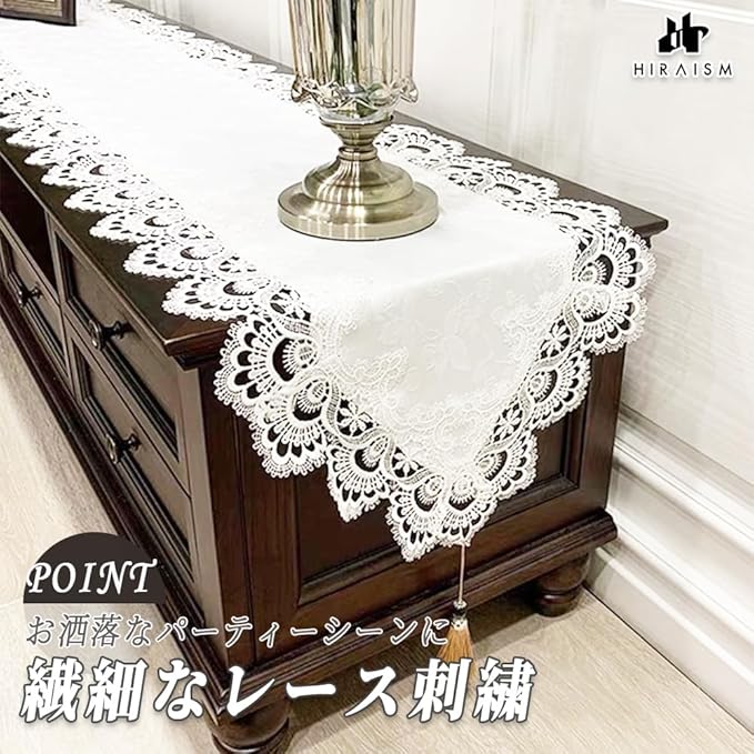 HIRAISM テーブルランナー タッセル レース刺繍 北欧風 お洒落 インテリア ホワイト (180cm)