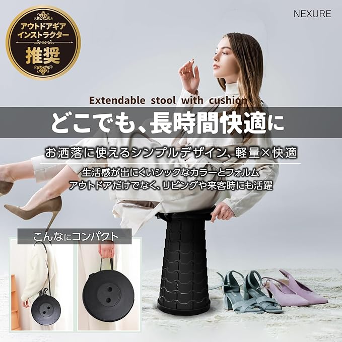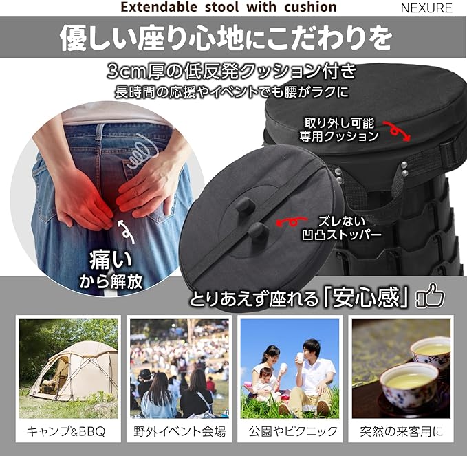 【伸縮スツール 折りたたみ椅子 3cm厚クッション/収納バッグ付】NEXURE 軽量 コンパクト 持ち運び 伸縮式 耐荷重180kg 高さ調整可能 キャンプ スポーツ観戦 運動会 ファミリー 日本語説明書付き
