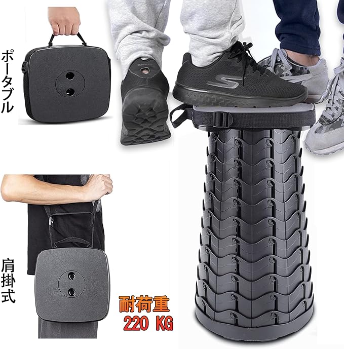 【使い方簡単、持ち運び便利】使い方簡単:少しひねりを入れながら両端を引くだけでスツールが完成。収納は逆方向に少しひねりを入れながら両端を押すだけで収納可能。また、ストラップ付きで、手に持ってでも、肩に掛けても、便利です。