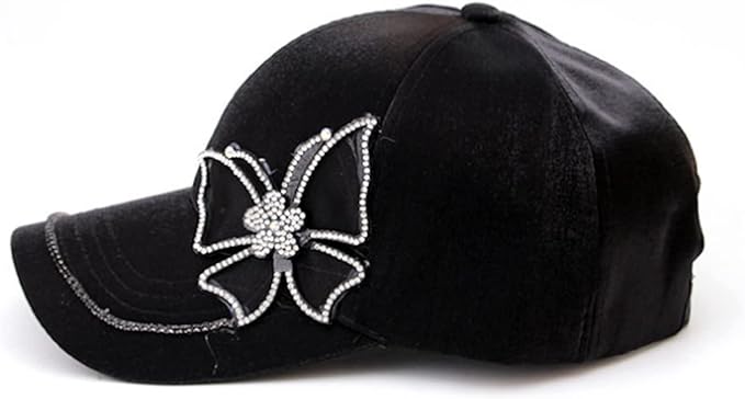 輝くラインストーンで描かれた優雅な蝶のモチーフが特徴的なキャップです。