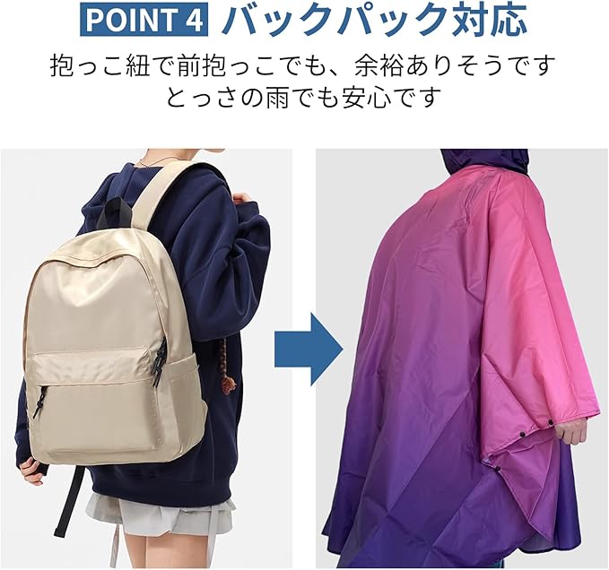 【大きめサイズ&リュック対応】 レインウェアの長さは膝下までしっかりカバーするデザインで、男女兼用のゆったりシルエット。背面のボタンを開ければ、リュックや鞄を背負ったままでも快適に着用可能。自転車やハイキング時にも全身を覆い、動きやすさを損ないません。