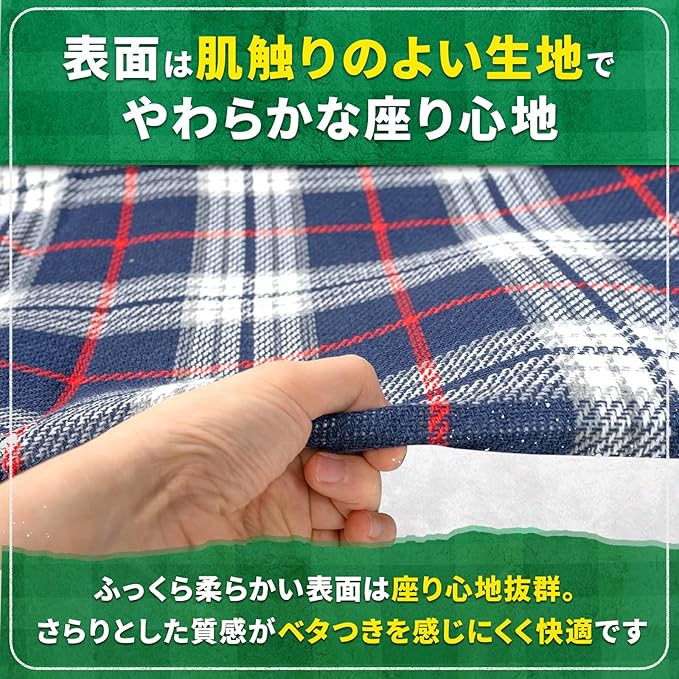 柔らかな肌触りと、冷えを感じさせない三層構造。地面の冷たさを感じさせず肌ざわりが柔らかなのが特徴。クッション性もあるので、座り心地が抜群。