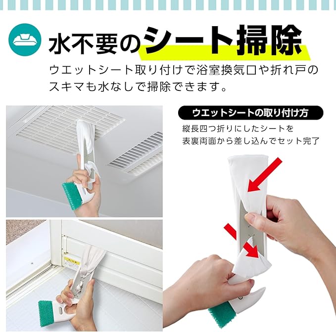 ヘラの上にウエットシートを取り付けられるので、浴室換気口等の狭いスキマをお掃除することができます。
