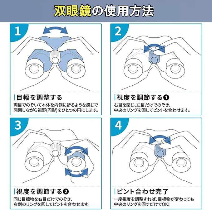 生活防水&使用方法:この製品は生活防水レベルに達することができます。雪や雨が本体に降っても、乾いたきれいなポリエステルまたは両面フランネルで拭き取るだけで、その後の使用に影響しません。32mmから75mmまでの目幅は調整可能で。たった3つのステップで臨場感あふれる画像を楽しめます。①目幅を調整 → ②ピントリングを調整 → ③視度調整リングを回す。自分に合った目幅に調整できます。