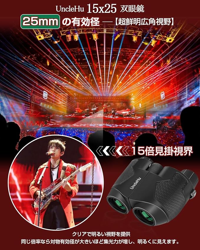 UncleHu 双眼鏡 15倍 ライブ用 東京ドーム 【視角移動時の振動を防ぐ・鮮明によく見える】 双眼鏡 コンサート オペラグラス 防振 防水 スポーツ観戦 観劇 手ぶれ補正 目幅調整 スタジアム 光遮りアイカップ 豪華付属品7点セット 日本語説明書付き(ブラック)