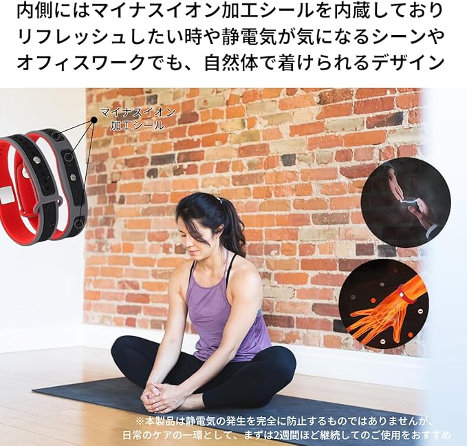 内側にはマイナスイオン加工シールを内蔵しております。リフレッシュしたい時や静電気が気になるシーンやオフィスワークでも、自然体で着けられるデザイン