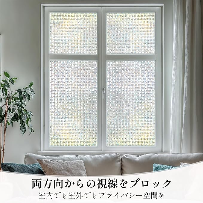 【目隠し、プライバシー保護】フィルムは元々透明なものですが、ガラスに貼れば光を屈折して半透明になって、虹色の艶を放します。光や使用環境によって、色や目隠し効果は少々異なります。光りが当たるとキラキラと虹色に輝きます。天然の日光が差し込む朝・昼も綺麗ですが、人工的なライトが映る夜も綺麗です。部屋のおしゃれな演出と目隠しの両立できます。外から室内が見えづらく、遠い目のプライバシーを保護します。外からの視線を遮りながら、かつ、充分に外の光を室内に取り込めます。カーテンを閉めているときの閉塞感や窮屈感あるの暗い部屋から解放されるでしょう。※目隠しレベル:★★★☆☆ フィルムの格子の模様部分から薄っすら透けて見えるので、お風呂のガラスのような場所に使用することは、お勧めいたしません。
