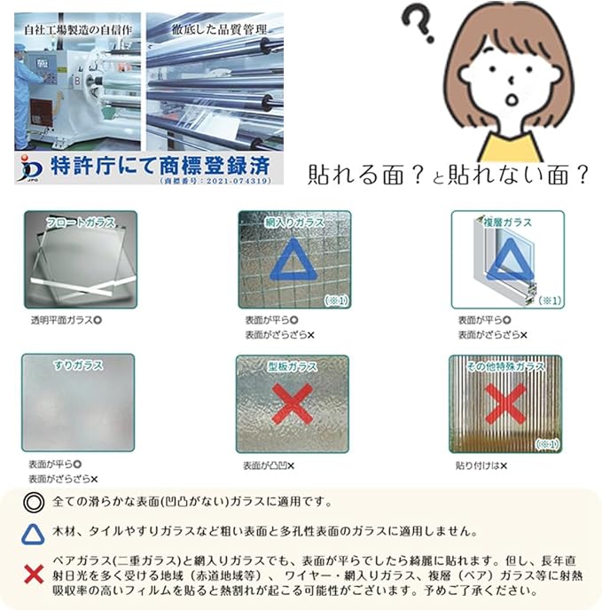 【注意】網入りガラスやペアガラス(二重ガラス)でも、表面が平らであれば綺麗に貼ることができます。ただし、網入りガラスや複層ガラスなど一部の特殊ガラスは熱がこもりやすく、高熱を吸収するフィルムを貼ると熱割れが起こる可能性があるため、非推奨です。予めご了承ください。また、保護フィルムをはがす際は、両サイドからゆっくり優しくはがし、平らな状態を保ちながら操作してください。