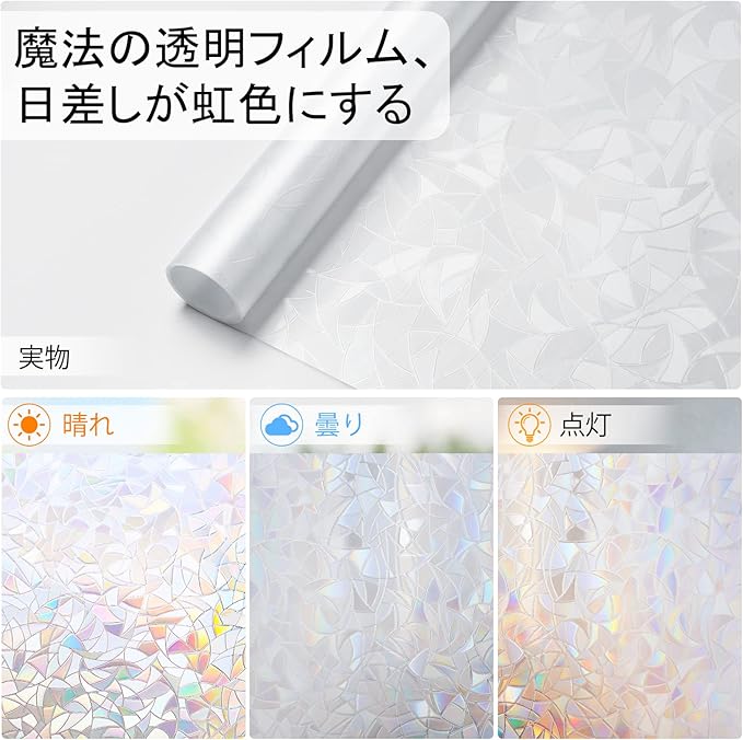 モダンなインテリア:届いた商品は「無色透明」ですが、日差しが通す時は虹色になったりし、立体感が生まれます。低コストで部屋全体を変える一枚!DIY・リフォームを楽しめる重宝です。