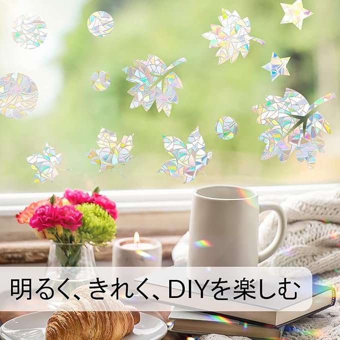 目隠し・UVカット:日差しやライトの光などのあたる所にはれば、虹色になったりし、可視光を反射して目隠しになったりします。光が強ければ強いほどカラフルになります。また、紫外線UVA 84%・UVB99% 以上カットし、際の家具や床材の劣化、肌にもたらす損害を大幅軽減します。要注意:設置の成功は使い方次第です。商品の説明ページの使い方と注意事項を丁寧にお読みください。