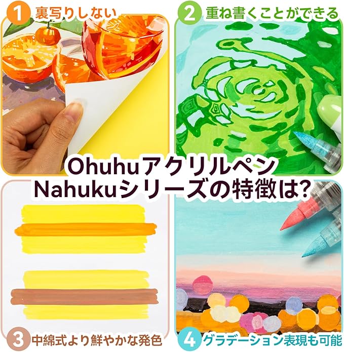 Ohuhu アクリルマーカー 筆タイプ 44色48本セット 直液式 アクリルペン 不透明水性ペン ペイントマーカー 石 木材 卵 ガラス セラミック キャンバス プラスチック 紙 金属 DIY 収納ケースと日本語取り扱い説明書付き
