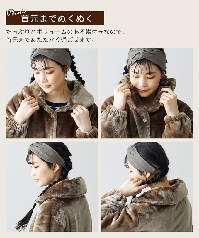 ■首回りもしっかりあったか たっぷりとボリュームのある襟付きなので首元まであたたかく過ごせます。 ■ガウンとしても着用できる ワンピースとしての着用だけでなく、ボタンを開ければガウンのようにパジャマの上から羽織ることもできます。