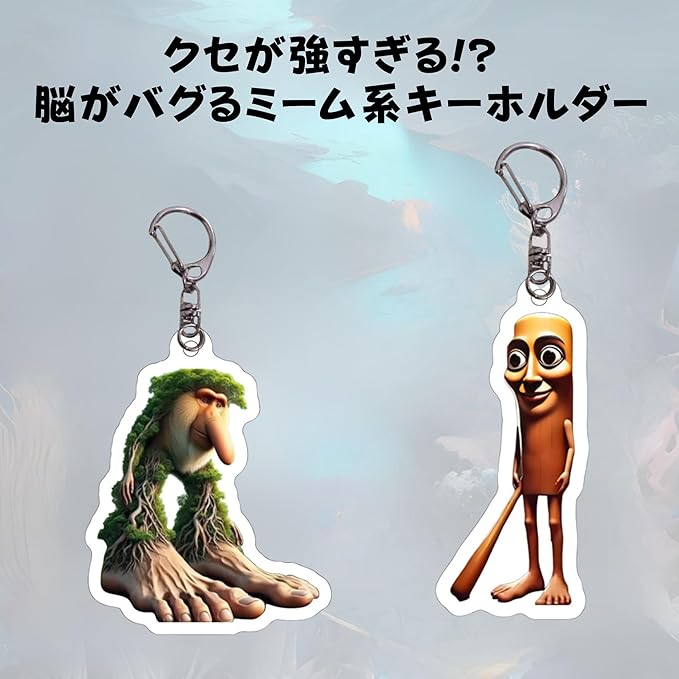 ユニークでちょっぴりカオスなデザインが目を引き、バッグや鍵に付ければインパクト抜群。透明アクリル製でプリントも鮮やか、カラビナ付きで取り付けも簡単です。