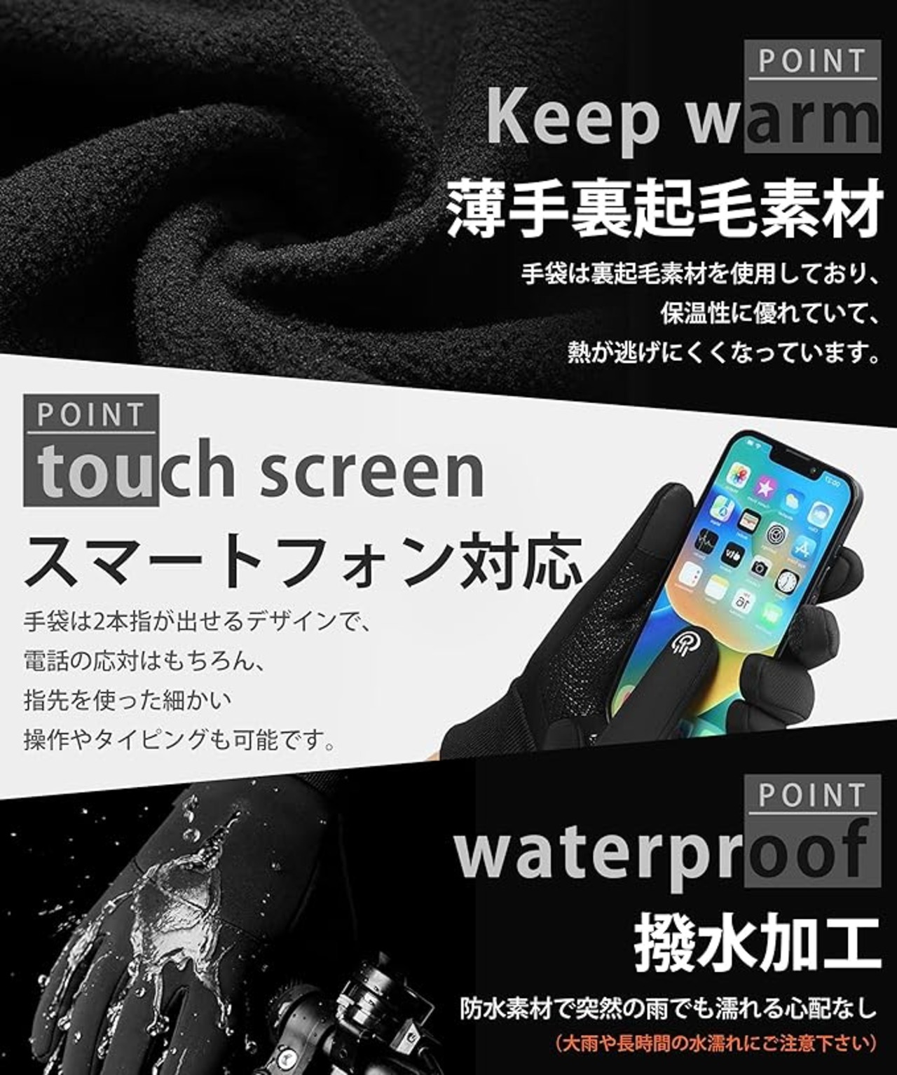 【柔らかく裏起毛・防風撥水設計】:サイクリンググローブは冷たい空気の侵入を防ぎ、手袋の内側には薄手の裏起毛使用しており、手の感覚や動きを妨げることはありません。裏地に使用された裏起毛素材が寒い冬でも手元をしっかりと暖かく保ちます。高性能防風素材と裏地デザインにより、より効果的に保温します。指先まで続く柔らかく快適な起毛素材は高い保温性を持ち、寒い冬でも肌に優しく、暖かく、快適な着用感を実現します。手袋の表面は撥水加工済みで、雨や雪の日でも安心してご使用いただけます。(ご注意:大雨の中で使用すると濡れてしまう恐れがあります。)